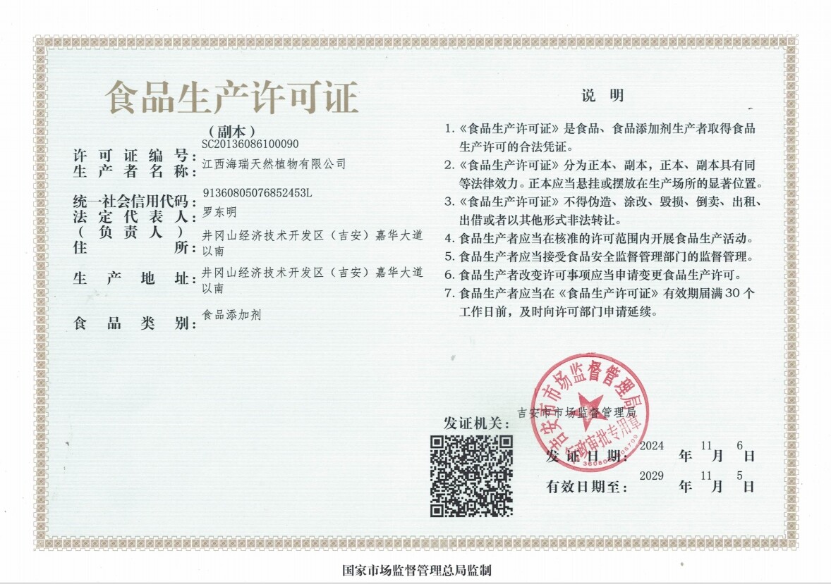 Jiangxi Hairui Natural Plant Co., Ltd. is a high-tech enterprise integrating the R&D, purification, processing and sales of active monomers and active ingredients from natural plants. Founded in 2006, the company is located in Jinggangshan Economic and Technological Development Zone, Ji'an City, at the foot of Jinggangshan, a renowned revolutionary base area. Covering a land area of 1.472 hectares with a building area of 15,000 square meters, the company has a total investment of more than 56 million RMB.